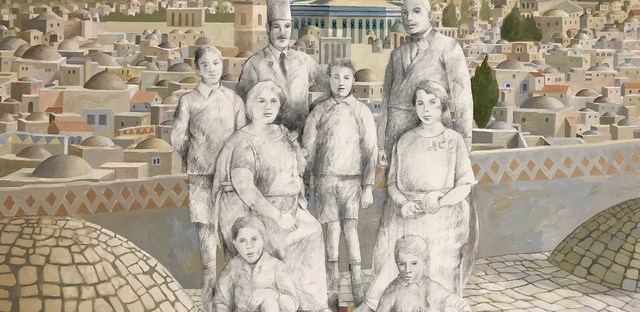 Pictured: Sliman Mansour’s A Family without a Shadow. Mansour, notes the gallery, ‘calls in his artwork upon the ghosts of the past to haunt the city’s present time’.