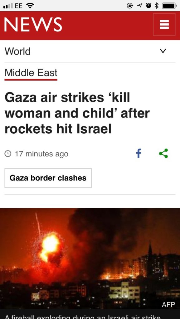 The BBC complied, finally changing the headline to ‘Gaza air strikes “kill woman and child” after rockets hit Israel’. It thus conformed to the Israeli narrative that its attacks on Gaza are acts of retaliation rather than forms of collective punishment, and in the process got rid of the inconvenient term ‘baby’ too.