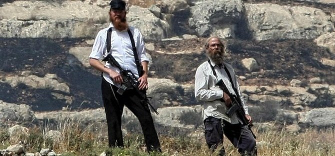 *Photo: Armed settlers stand on a cliff overlooking the Palestinian village below (AFP)
